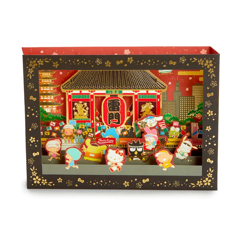 This beautiful, gilded greeting card features Hello Kitty and Friends running a marathon in front of the temple gate in Asakusa district. The pop-up design features specifically the Kaminarimon with it's giant red lantern and statues on the side. Write a note on the blank space at the back and tuck it into the cute pink envelope